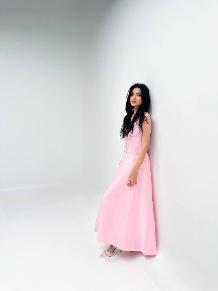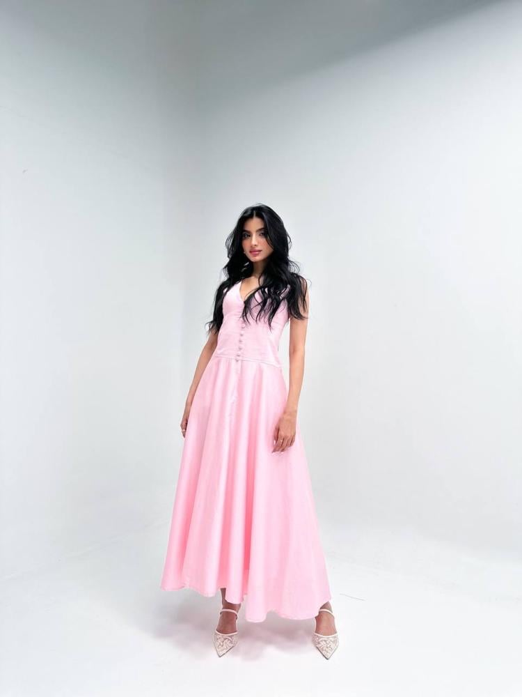“تالقي بفستان صيفي بلون الصيف، تصميم أنثوي يبرز الخصر يأتي مصنوعاً من القطن وتصميم يجمع بين راحة والاناقه، مثالي للمناسبات والخروج اليومي.
